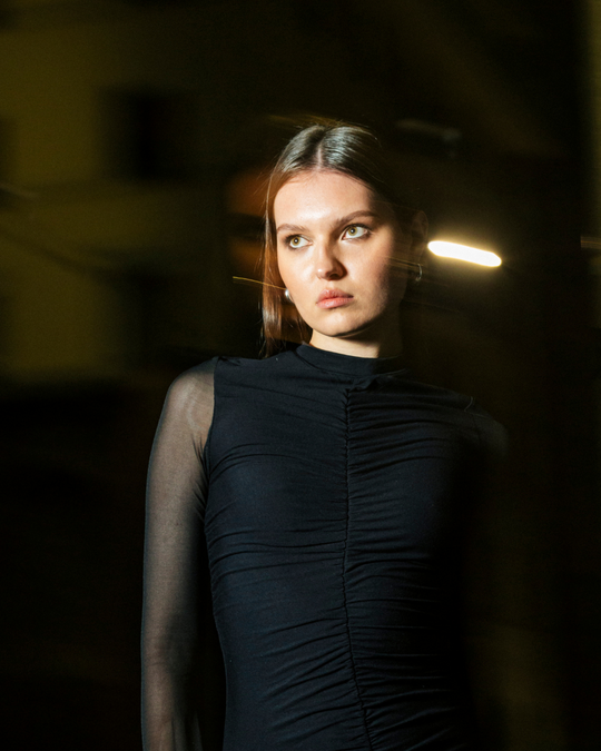 Mezzanotte a Milano: l'eleganza prende una piega audace con un gioco di tagli, drappeggi e il tocco etereo del tulle, creando silhouette che si fondono con le luci della città.