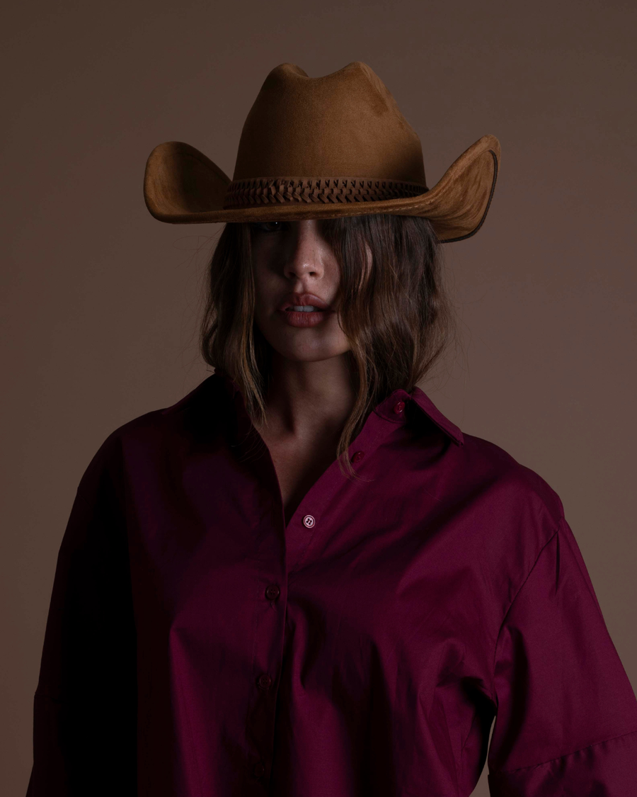 . Cappello in eco suede color tabacco con cinta intrecciata